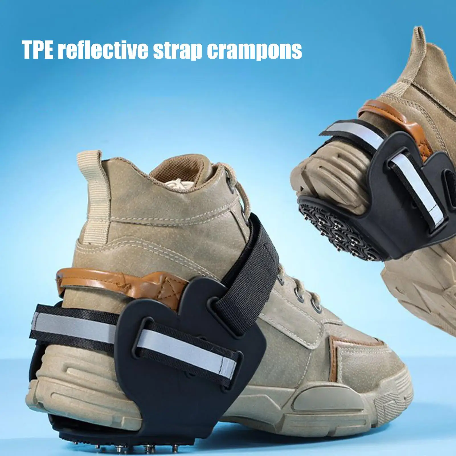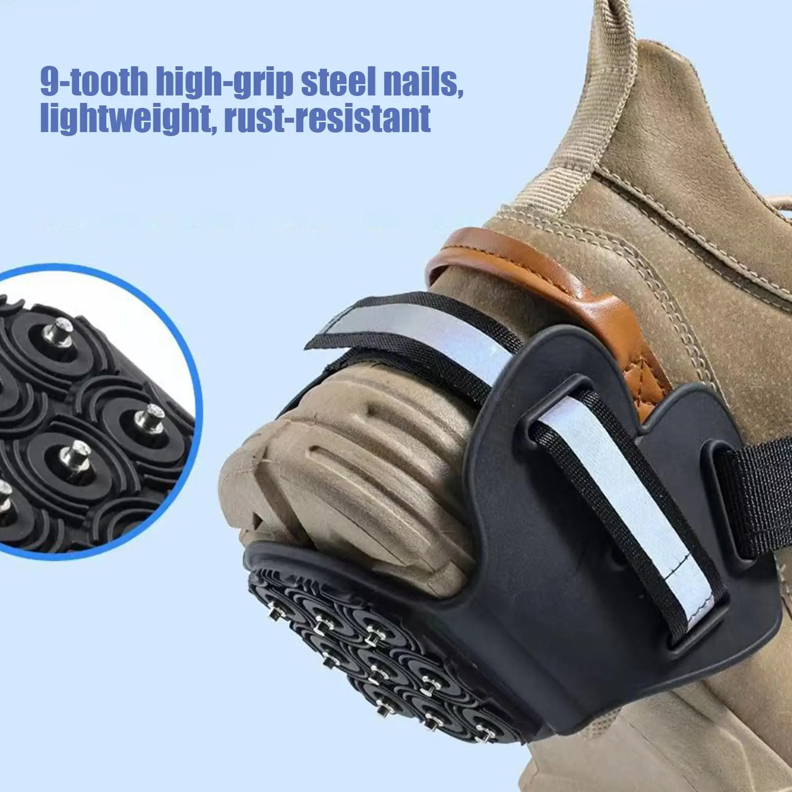 2.Enhanced Night Visibility: Ice cleats for boots feature a reflective strip that automatically reflects light from car headlights and streetlights, ensuring you are more easily noticed during nighttime hiking or jogging activities, enhancing safety in low-light conditions